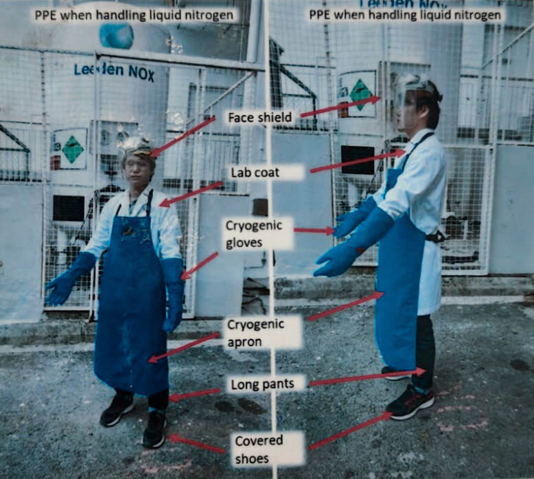 After withdrawal of keys, users may proceed to withdraw LN2 with the required PPE as shown below. Users and their respective research groups may be banned from using this facility if found not compliant to the safety requirements. Users are to return the keys immediately after LN2 withdrawal..